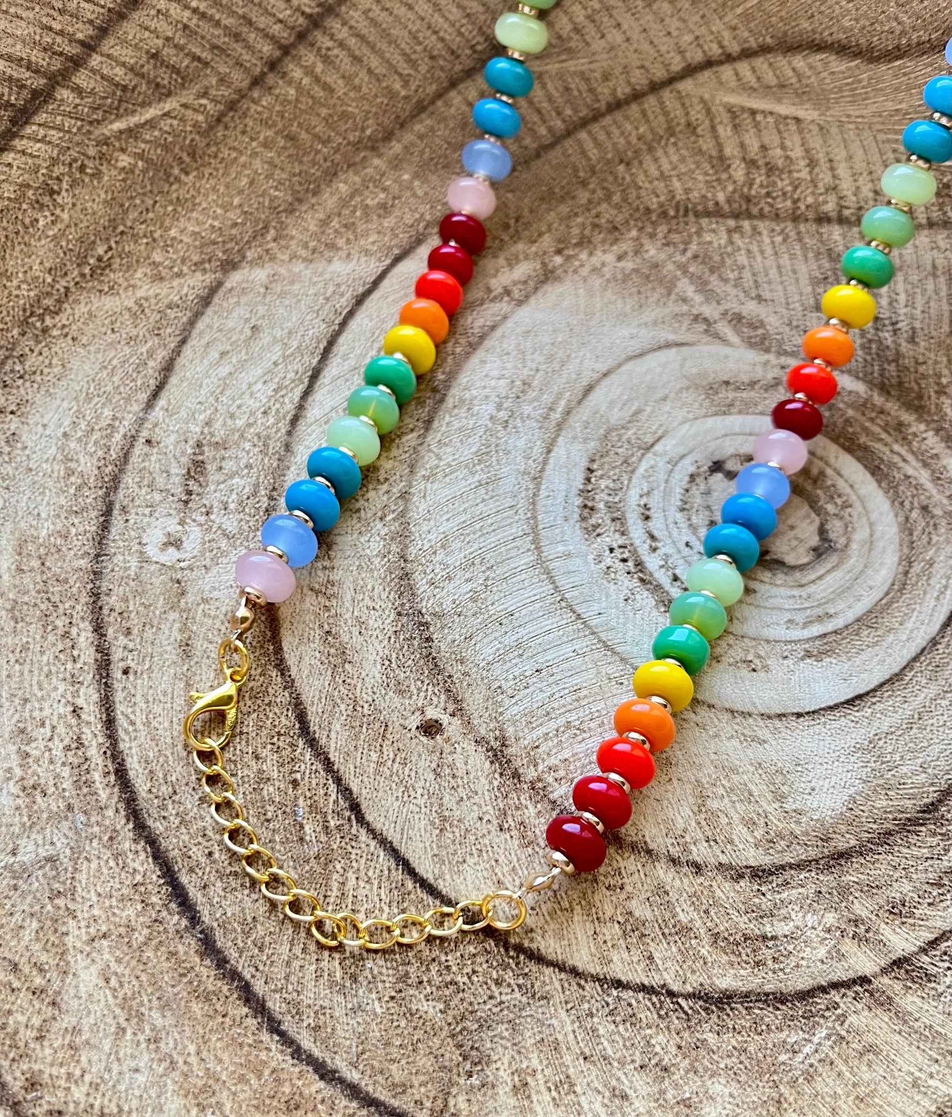 Candy Drop – Rainbow Necklace | Glass Rondelle & 18K Gold Plated Beaded Necklace with extender and clasp closure