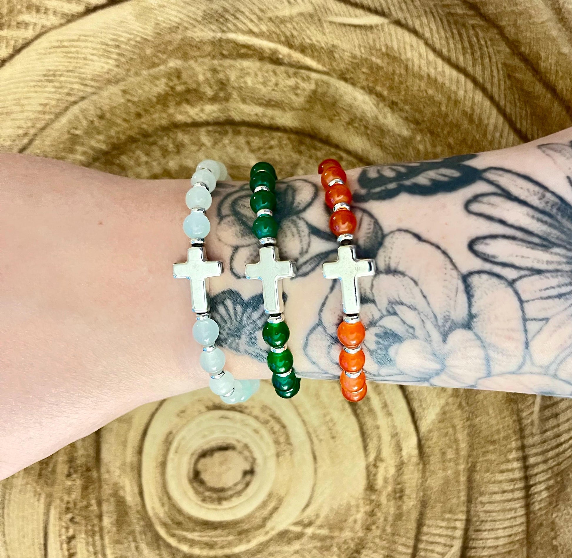 Embrace your faith with style and purpose with our Forever Faithful bracelet collection. These handmade stretch bracelets feature vibrant glass beads in earthy orange, deep green, and soft aquamarine, each centered with a sleek silver-toned cross charm. Whether worn individually or stacked together, they offer a meaningful and elegant expression of your beliefs.