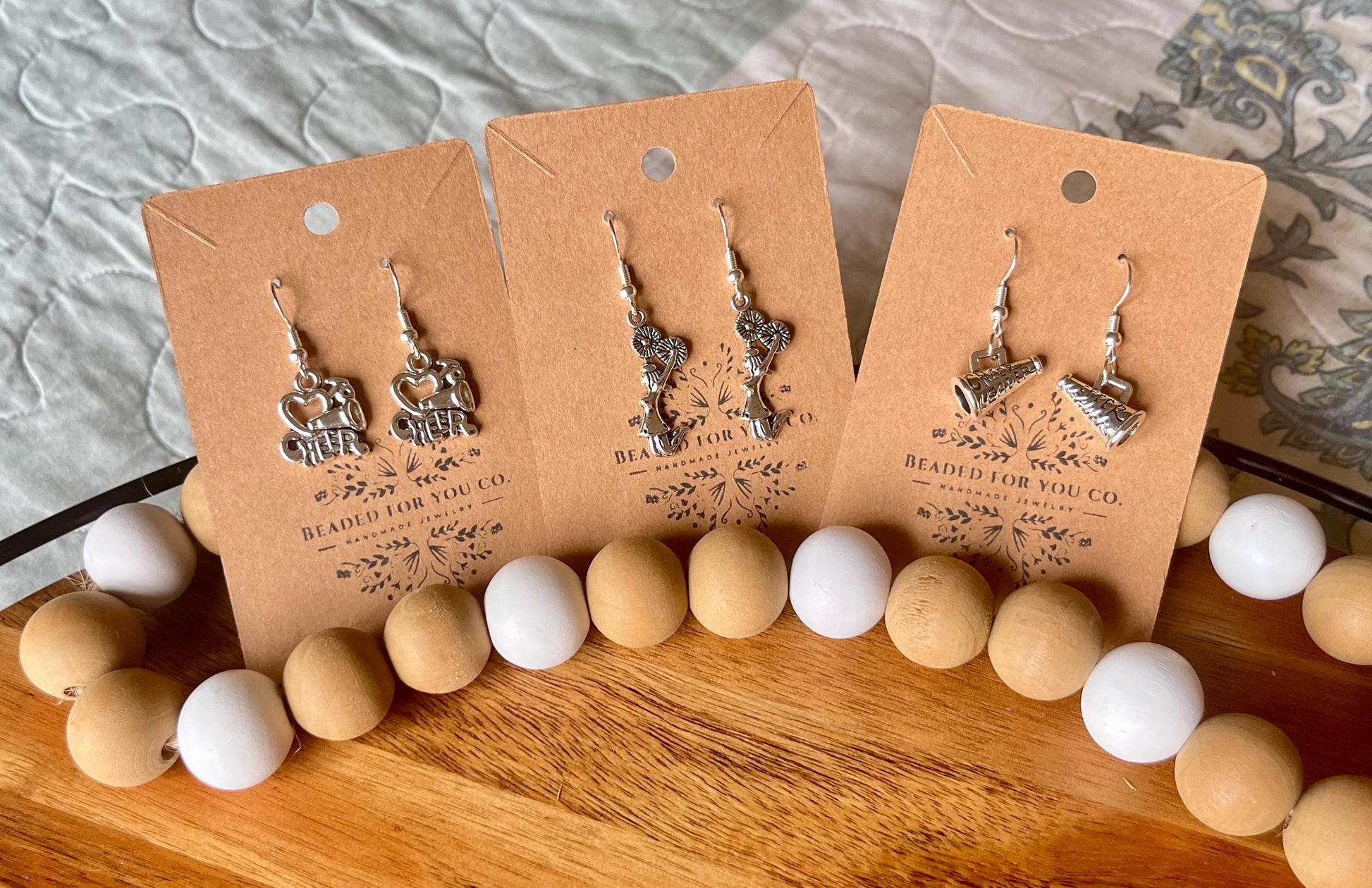 Handmade Sterling Silver Cheer Charm Earrings – Megaphone, Cheerleader, or I Heart Cheer | Spirit Gift for Cheerleaders