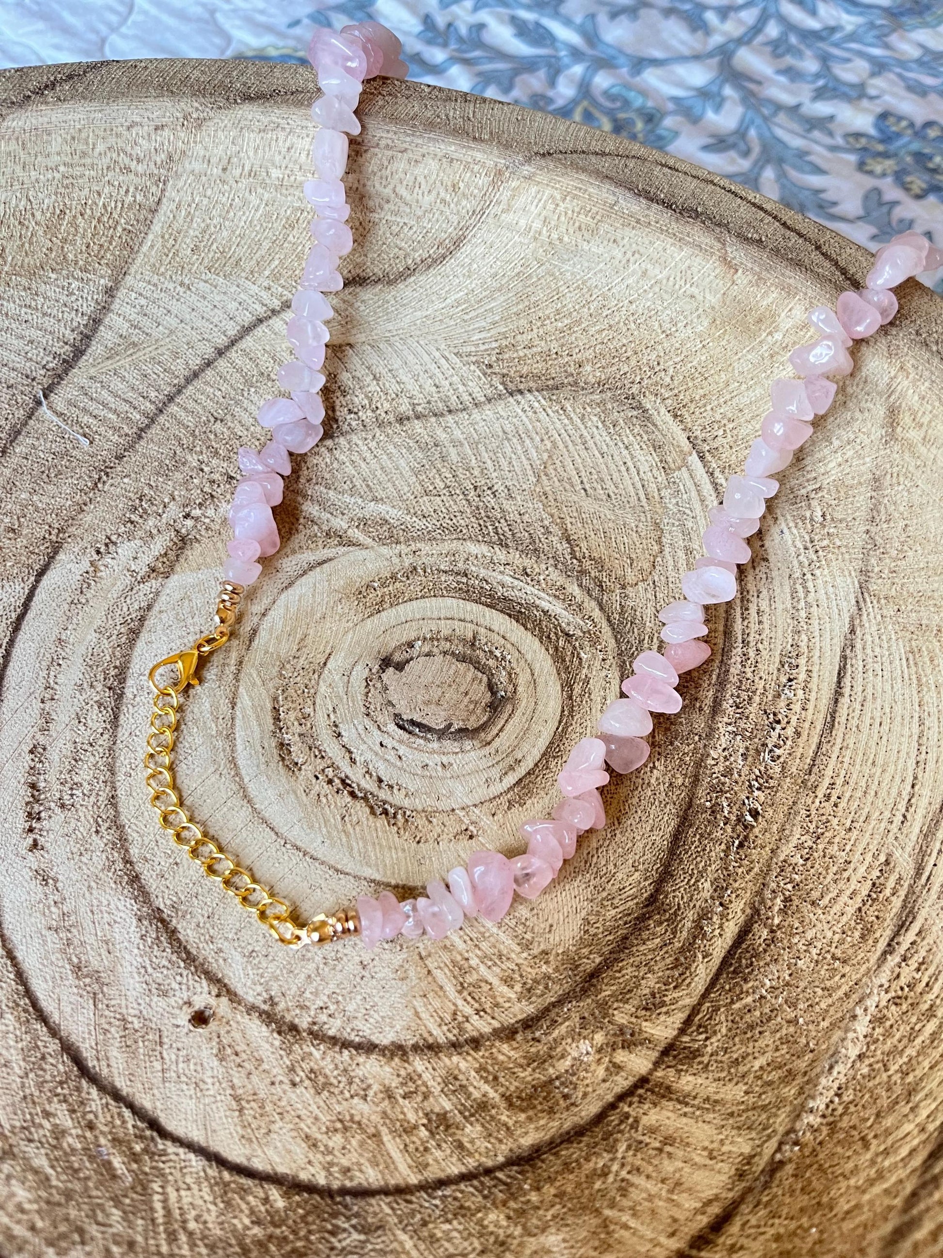 Infused with gentle elegance, this rose quartz chip beaded necklace brings a touch of natural beauty and calming energy to any look. Each uniquely shaped rose quartz bead is hand-strung to showcase its soft pink hue and raw charm. The necklace is finished with an 18k gold-plated clasp and extender, offering both luxury and adjustability for the perfect fit. Whether worn alone or layered, this piece adds a delicate, bohemian glow to your everyday style.